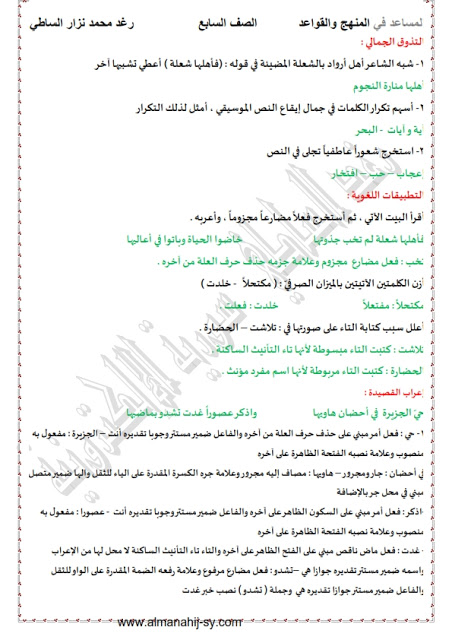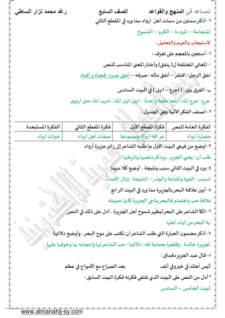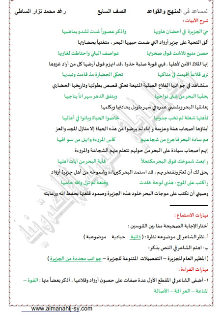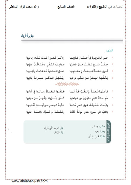 حل قصيدة جزيرة ارواد في مادة اللغة العربية للصف السابع من الفصل الدراسي الثاني من العام الدراسي 2019-2020م وفق المناهج السورية.