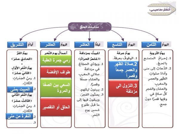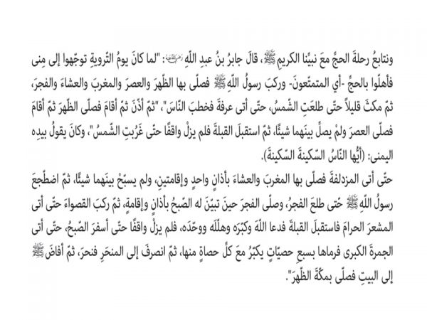 1، إحرام المتمتع بالحج، 2. الذهاب لـ منی وأداء صلوات الظهر والعصر والمغرب والعشاء والفجر كل صلاة في وقتها قصرا دون جمع