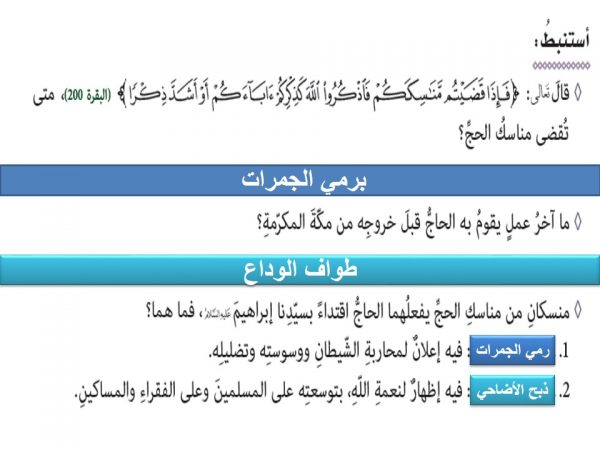 رمي الجمرات فيه إعلان لمحاربة الشيطان ووسوسته وتضليله. ذبح الأضاحي : فيه إظهار لنعمة الله، بتوسعته على المسلمين وعلى الفقراء والمساكين.
