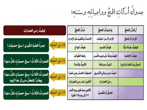 الإحرام من الميقات . طواف القدوم . الوقوف بعرفة حتى غروب الشمس. المبيت بمزدلفة . البيت بمنى ليالي التشريق