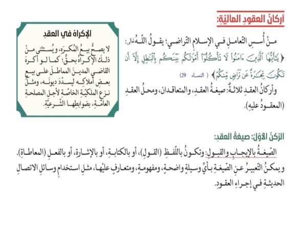 حل دراسة العقود المالية في التربية الإسلامية الصف الحادي عشر الفصل الأول