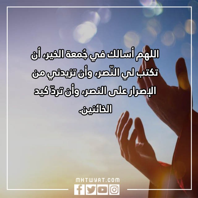 - اللهم في هذه الجمعة أسألك أن تسجل لي النصر، وتزيد إصراري على تحقيق النصر، ودفع فخاخ الخونة. اخجلهم بقية حياتهم ولا ترفع رأيك فيهم يا صديقي.