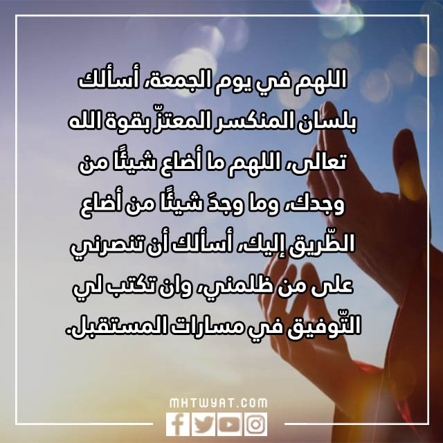 - اللهمّ في يوم الجمعة، أسألك بلسانٍ مكسورٍ مُفتخراً بقدرة الله عز وجل، اللهمّ من وجدك لم يفقد شيئاً، ومن ضل عنك لم ينكر شيئاً. أطلب منك أن تدعمني ضد من يضطهدني وأن تقودني لـ النجاح في الوقت الحاضر.