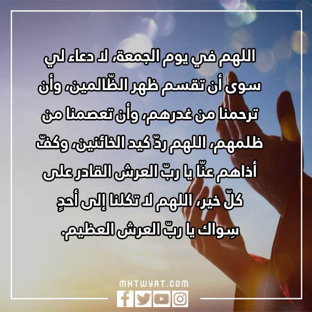 - اللهم ليس لي دعاء غير أن تكسر ظهور الظالمين في يوم الجمعة، وارحمنا من خياناتهم، وأعذنا من مظالمهم، اللهم اكشف كيد الخائنين. كف عنا عذاباً يا رب العرش العظيم، ولا تكلني لـ غيرك يا رب العرش العظيم.