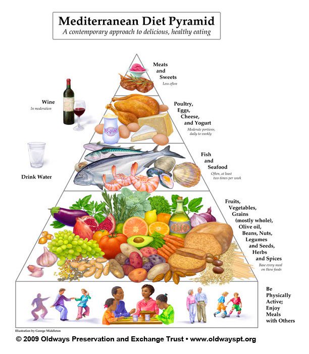 إنها توصية نظام غذائي حديث مستوحى من أنماط الطعام التقليدية في اليونان وجنوب إيطاليا وإسبانيا.[1][2] المغرب وبعض مناطق البحر الأبيض المتوسط والجوانب الرئيسية لهذا النظام الغذائي تشمل كميات عالية من زيت الزيتون والبقوليات والحبوب غير المكررة والفواكه والخضروات ، وكميات متوسطة لـ عدد ضخم من استهلاك الأسماك ، والاستهلاك المعتدل لمنتجات الألبان (خاصة الجبن واللبن) ، والاستهلاك المعتدل للنبيذ ، وانخفاض استهلاك اللحوم ومنتجاتها.[3]