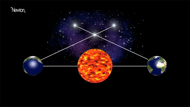 في مرحلة ما نرى الأرض في ضمن الشمس على يمينها ، وبعد ستة أشهر تتحول لـ يسار الشمس. ونرى كيف يرسم العلماء خطًا مستقيمًا (مضللًا) يربط نقطة على سطح الأرض بالنجم المطلوب ، وبعد ستة أشهر يرسم العلماء نفس الخط للنجم المطلوب ويتشكل مثلث مثلث. .