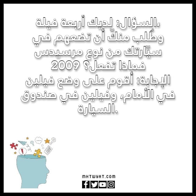 - سؤال: لديك أربعة أفيال وطلب منك وضعها في سيارتك المرسيدس 2009، فماذا تفعل؟