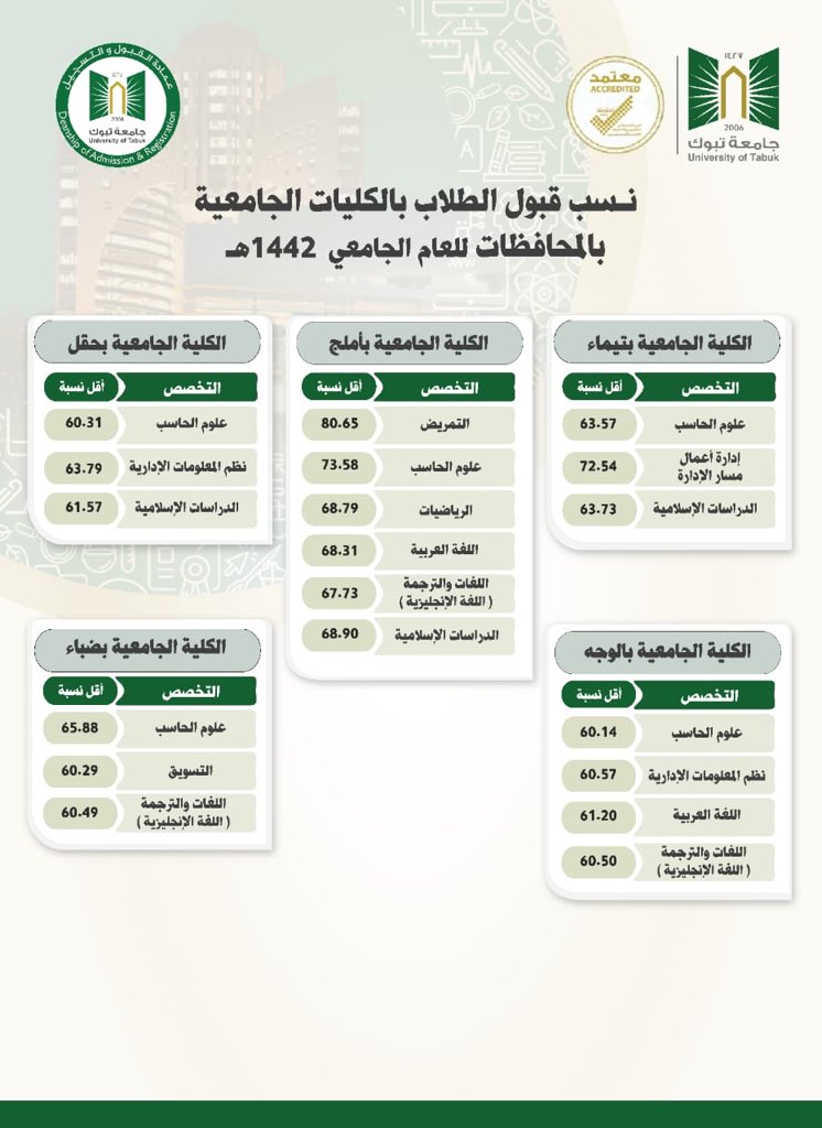 وكانت معدلات قبول الطالبات في تخصصات جامعة تبوك كالتالي: