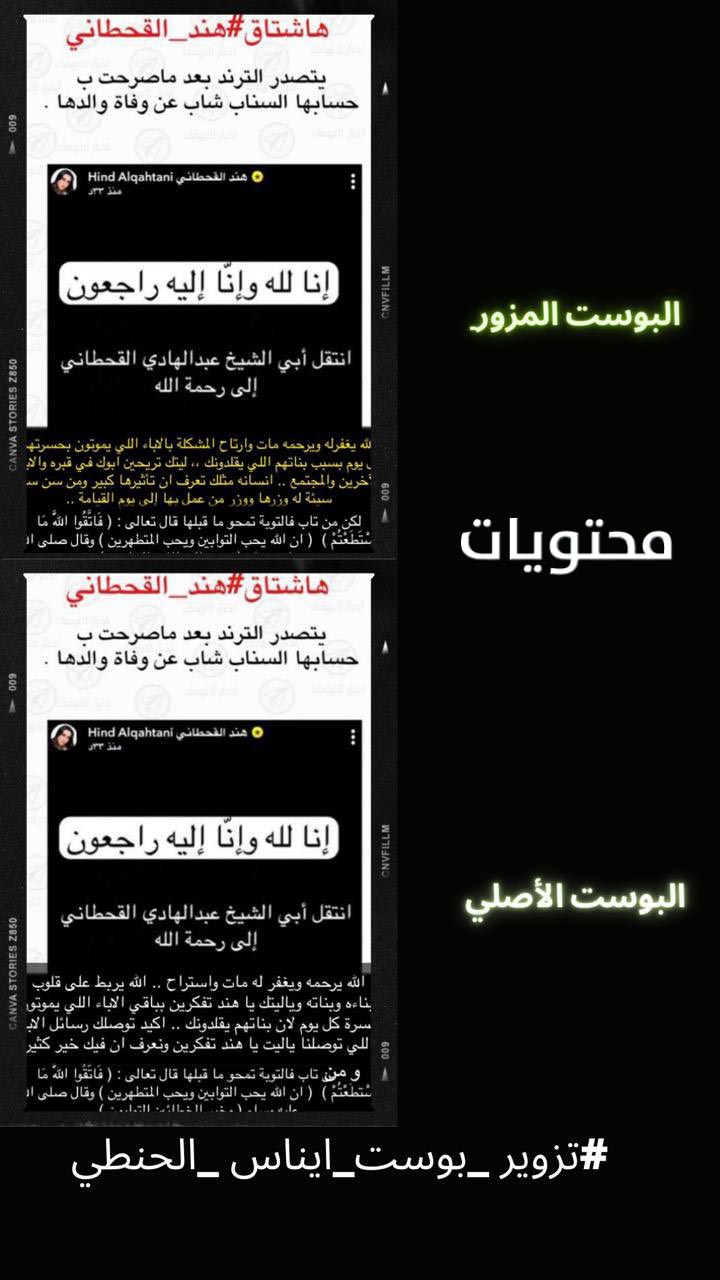 أثار تعليق إيناس الحنطي على مواقع السوشيال ميديا ضجة واسعة على مواقع السوشيال ميديا ، فتوزعت التعليقات بين تعليقات مؤيدة لهند القحطاني وتعليقات أخرى مؤيدة لتعليق الناشطة السعودية إيناس الحنطي ، وانتشرت صور كثيرة جدا. تعليق محرف لإيناس الحنطي على وفاة والد القحطاني مما أدى لـ إطلاق الهاشتاق#Forging_post_enna_nattiجاء التزوير على النحو التالي: