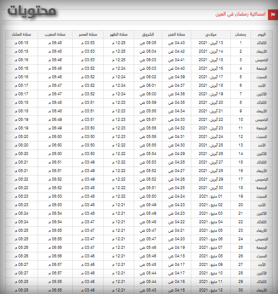 تعتبر مدينة العين من أهم مدن دولة الإمارات العربية المتحدة وتتبع إمارة أبوظبي ، وتحتل جزءًا كبيرًا من المنطقة الشرقية وتضم عددًا من مناطق الجذب السياحي المختلفة جدًا. توقيت الصلاة والإمساك في مدينة العين حيث دفن شهر رمضان 2021 في الإمارات خاصة بالشهر الكريم هي كالتالي: