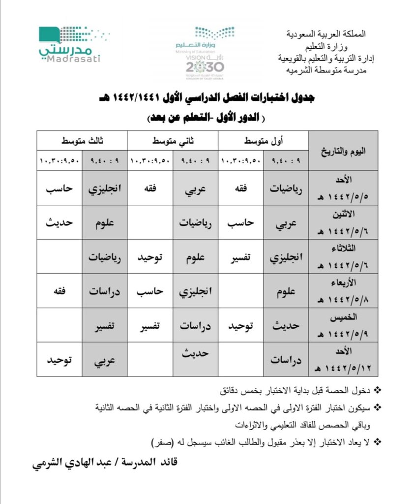 صرحت مدرسة عودة سدير أن قائد المدرسة ناصر النصرالله قد وافق على جدول الامتحانات النهائية للفصل الدراسي الأول للمرحلة المتوسطة على موسوعة مدرستي أو المنصة المدرسية وأن على أولياء الأمور متابعة أطفالهم وجدول الامتحانات على النحو التالي: