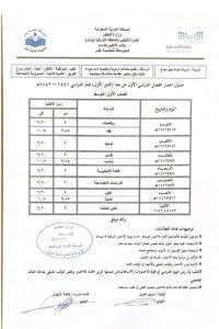 جدول امتحانات المرحلة المتوسطة P1 مدرسة عود سدير