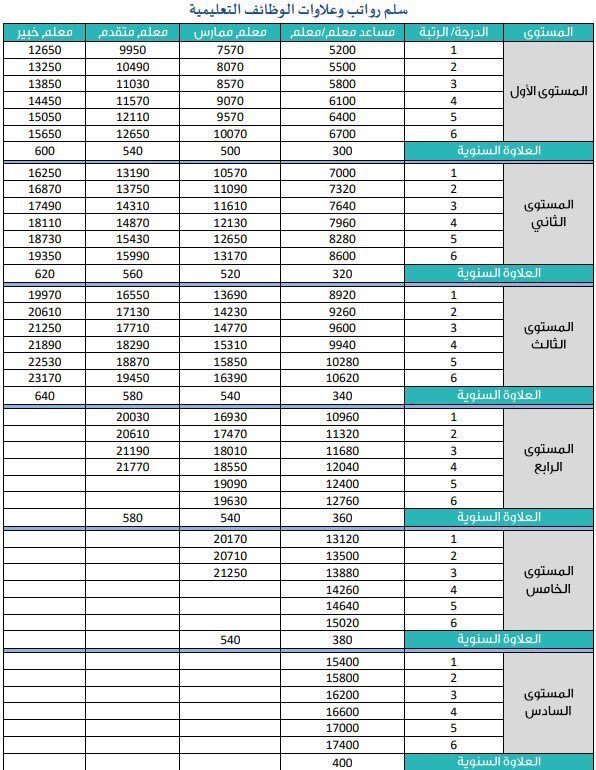 إن سلم رواتب الوظائف التعليمية يحتوي على 6 درجات، وتضم كل درجة 4 رتب بدء من مساعد المعلم، وتنتهي لـ المعلم الخبير، وفيما يأتي سلم رواتب المعلمين في المملكة العربية السعودية: