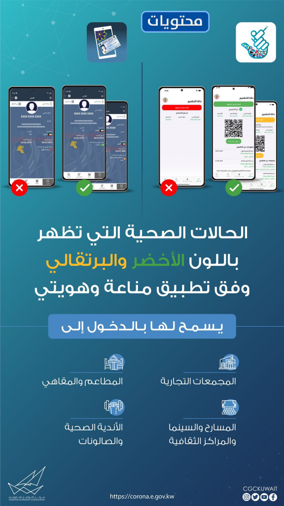 - يجب إذاعة شهادة التطعيم Covid-19 عبر تطبيق “My Identity” الذي يحتوي على بطاقة هوية رقمية أو تطبيق Imuna التابع لوزارة الصحة الكويتية.