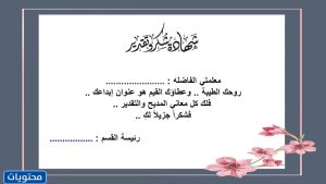 - تذهب إدارة مدرسة “اسم المدرسة” لتدريس “اسم المعلم ında في أعلى آيات من الشكر والتقدير على عملها المستمر وجهودها الكبيرة لرفع مستوى الطلاب.