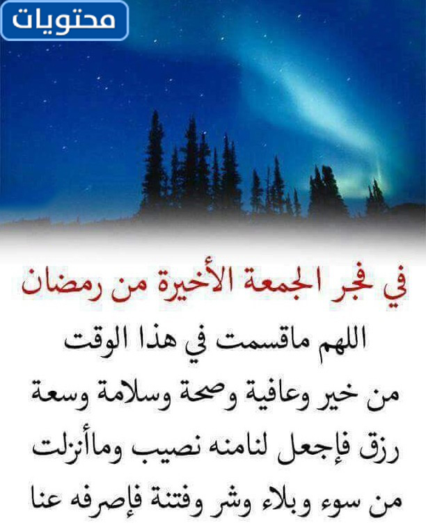 - اللهم اجعلنا في انتهاء جمعة من رمضان من الذين نجوا من النار ونتوب إلينا قبل الموت والموت والشهادة وبعد الموت من السماء والسعادة اللهم ويريح الآلام. الموت علينا. وافتحنا من بوابات رزقك الواسعة.