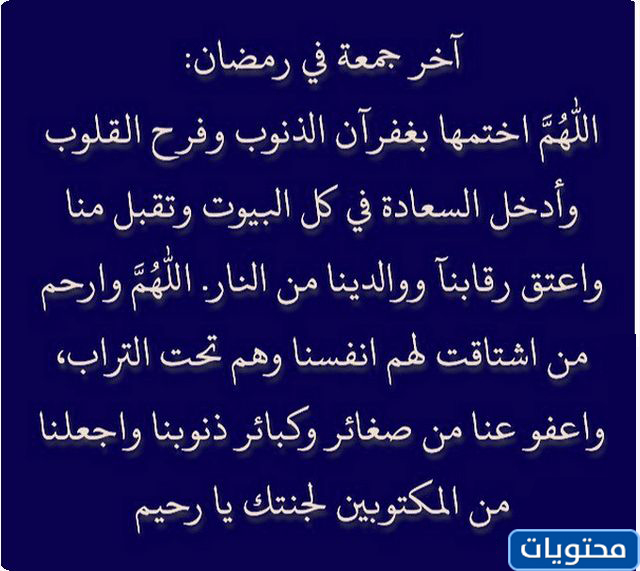 - في انتهاء جمعة من شهر رمضان أختم اللهم هذا بمغفرة الذنوب وفرح القلب ، أدخل السعادة في كل البيوت وتقبل منا ، وأنقذ عنقنا وأهلنا من النار.