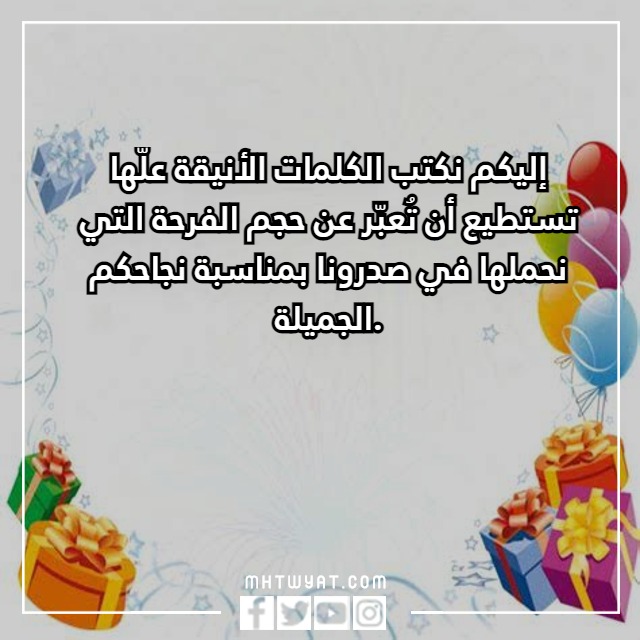 | البيان الثاني | بمناسبة نجاحكم على مستوى تفجيهي الذي يعتبر بدء الخير والكمال بإذن الله، نكتب هنا كلمات أنيقة مليئة بأجمل المشاعر وأحلى الذكريات. |