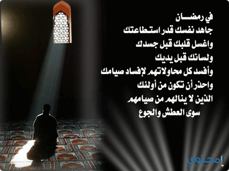 هو شهر العبادة والتضرع إلى الله حيث جاء هذا الشهر العظيم ليؤدي فيه المسلمون فريضة الصيام التي تستوجب التوقف عن الأكل والشراب والإمساك عن مختلف الشهوات مثل الجماع وذلك من بزوغ فجر اليوم إلى غروب الشمس وتكون فريضة الصيام هنا مقترنة بالتوقف عن كل المعاملات التي لا تليق بأخلاق المسلم والإقبال على العبادات والمعاملات التي يحبذها الله عز وجل.