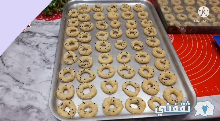 - ثم نقطع اللفائف لـ قطع متساوية ، ثم نشكل دائرة حول القطع ونغمس جوار واحد بخليط السمسم.