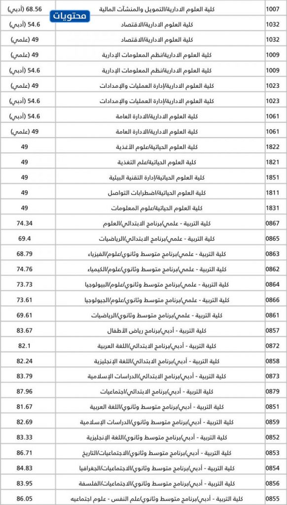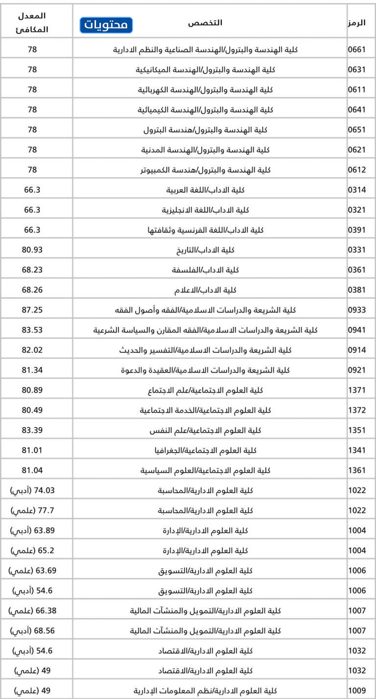 معدلات القبول لكليات جامعة الكويت كالتالي: