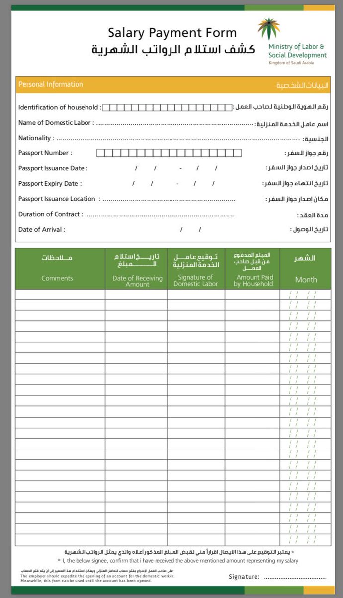 تقر المملكة العربية السعودية بعدد من الوثائق المهمة المتعلقة بالعمل في المملكة العربية السعودية. بيانات صحيحة للعامل ، بما في ذلك عملية رواتب العمال ، والتي يمكنك الاطلاع عليها “” بصيغة pdf ، والتي تحوي كتابة واضحة لكافة بيانات مكان العمل ، وكتابة كاملة وكاملة ، بالإضافة لـ القيمة المالية الشهرية لـ العامل أمام اسمه كل شهر طابور وختم واسم المؤسسة والمدير بالتوقيع والتوقيع هو العامل.